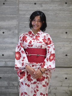 神戸の夏の風物詩となった「第44回みなとこうべ海上花火大会」に浴衣姿で駆け付けたお嬢様で、着付けは私どもの女将が担当致しました。とっても明るく可愛らしい方でした。